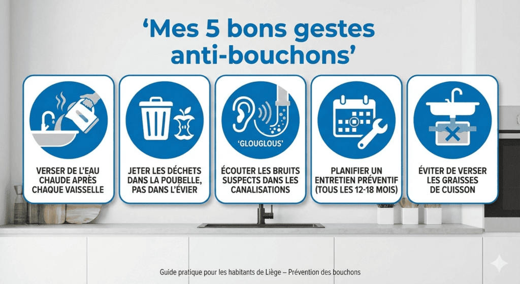 Pour éviter un débordement ou une inondation de cuisine et de cave, un entretien est recommandé tous les 12 à 18 mois. C’est particulièrement crucial dans les immeubles liégeois où les colonnes sont partagées entre plusieurs voisins.